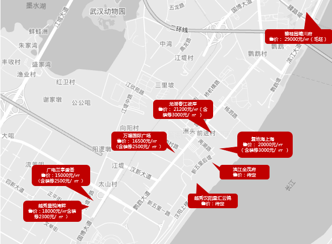 汉阳滨江区域房价为15000元/㎡-29000元/㎡,从入市产品分析,汉阳滨江区域大部分楼盘均以精装修入市, 精装修价格为2300-3000元/㎡。