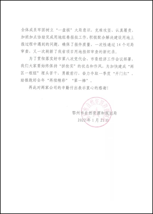 吴品涵、闫娟、李海桥、陈文静为代表的项目组全体成员精心组织、认真履责、加班加点协助完成了用地组卷工作,配合项目业主多次到自然资源部、省自然资源厅做好耐心细致地汇报工作,及时有效解决了实施过程中遇到的各种问题,以最短时间顺利拿到了项目国务院用地批文,促使项目依法开工建设。