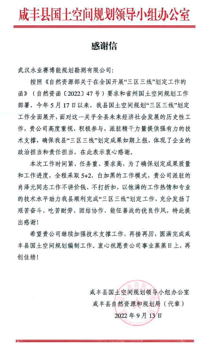 2022年9月13日,咸丰县国土空间规划领导小组办公室致函永业行,对我司参与的咸丰县国土空间规划“三区三线”划定工作给予肯定和感谢。